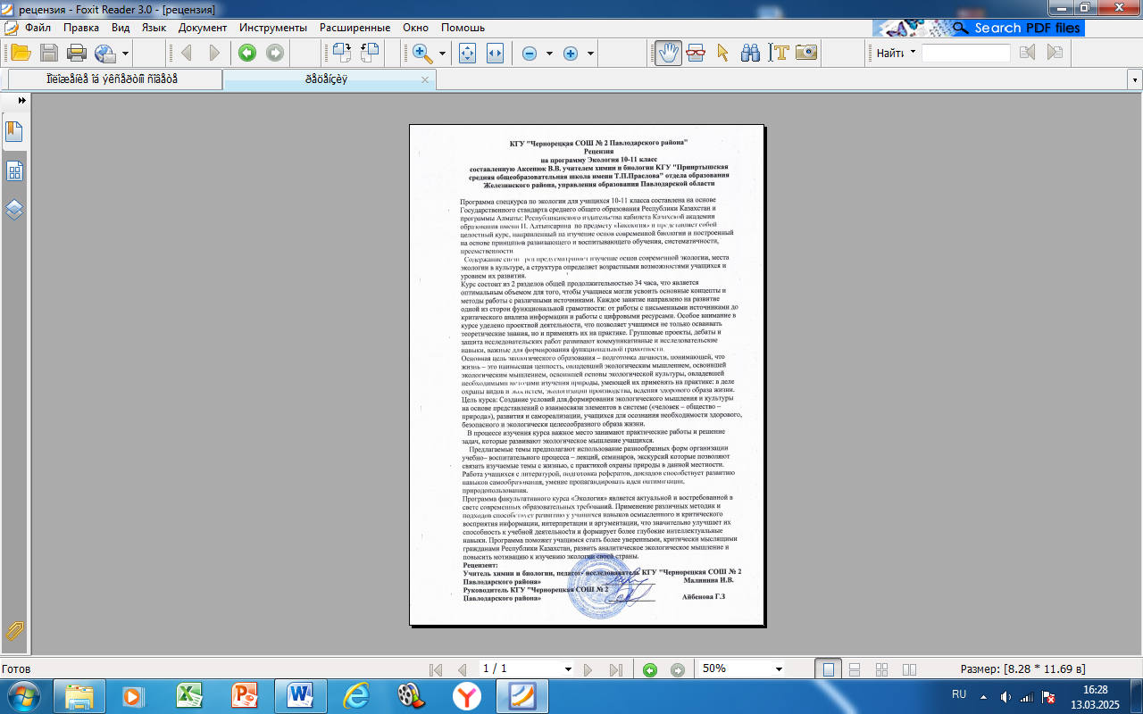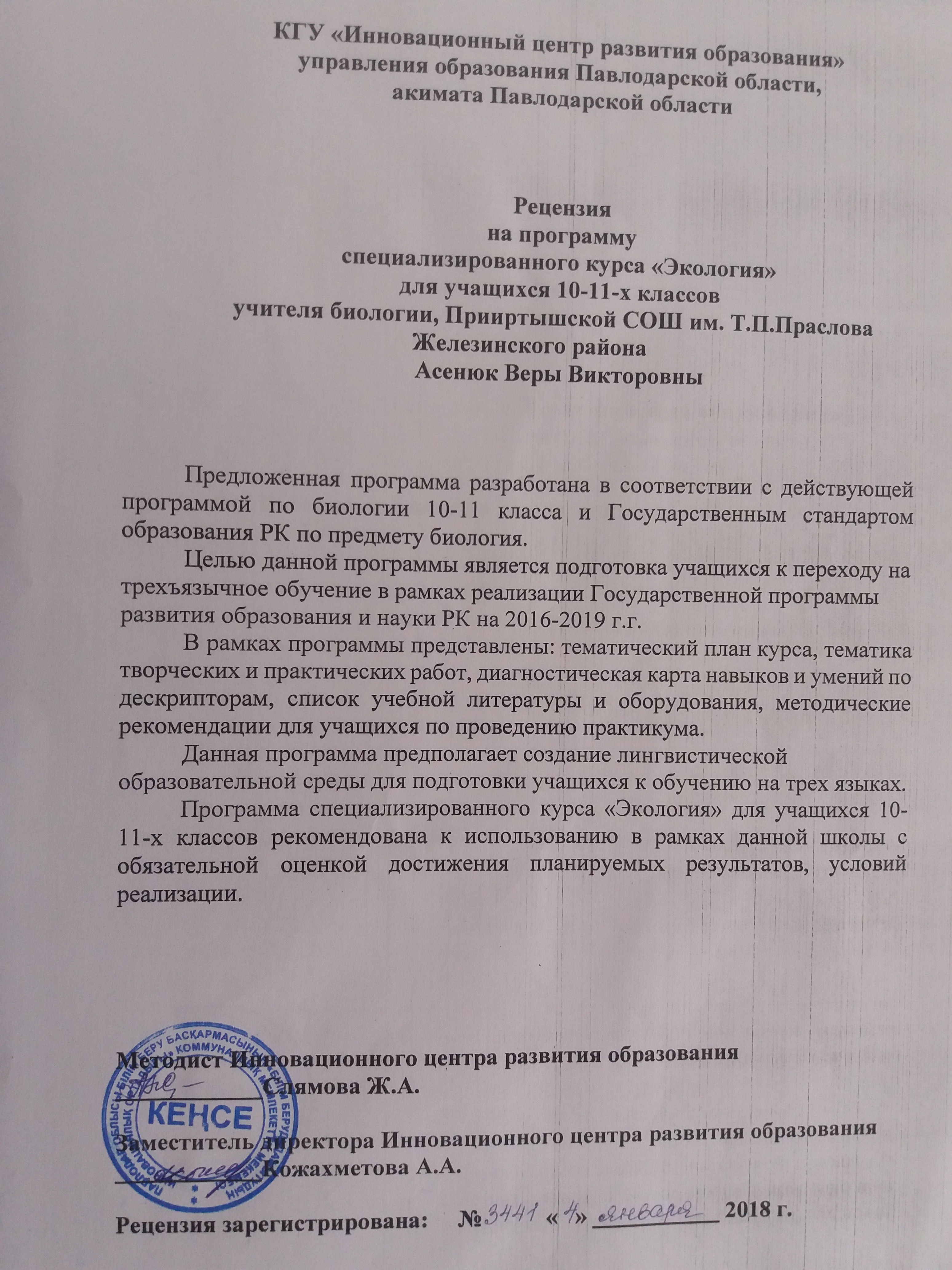 Программа cпецкурса по экологии для учащихся 10-11 класса составлена на основе Государственного cтандарта среднего общего образования Республики Казахстан и программы Алматы: Республиканского издательства кабинета Казахской академии образования имени И. Алтынсарина по предмету «Биология» и представляет собой целостный курс, направленный на изучение основ современной биологии и построенный на основе принципов развивающего и воспитывающего обучения, систематичности, преемственности.