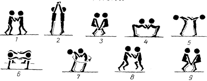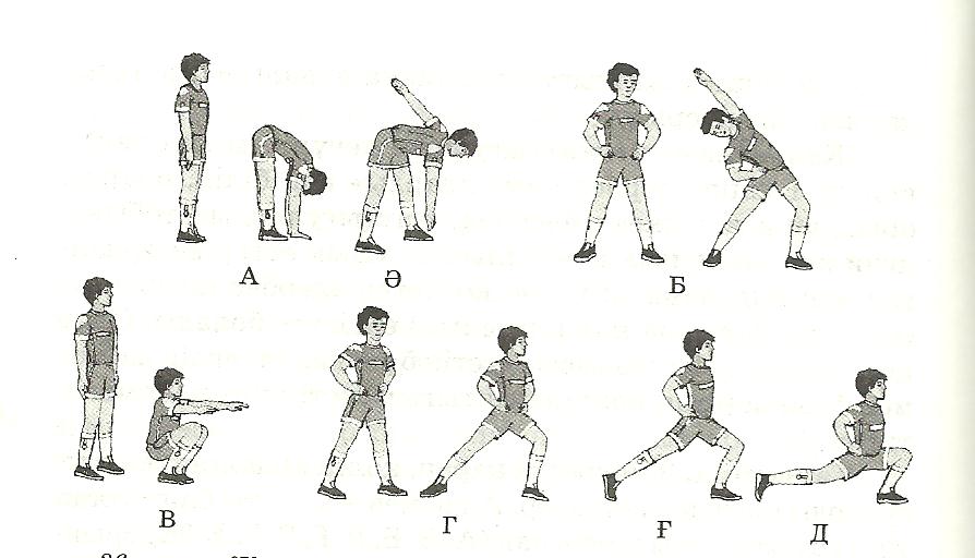 Бастапқы қалыпта тұру. -Бас, мойын, иық, кеуде жатт. -Бел, тізе, аяққа жатт. |