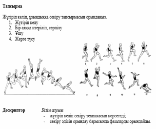 Тапсырма: Жүгіріп келіп ұзындыққа секіріңіз. Дескриптор: -екпін алып жүгіреді; -белгіленген сызықты баспай бір аяқпен серпіліп ұшады; -қос аяқты алға тастап, қолдың көмегімен барынша алға қарай ұмтылады; -қос аяқты алға тастап, секіру шұңқырына жамбаспен түседі; -қозғалыс түрін (секіру) анықтайды; -секіру (жүгіру, серпілу, ұшу, қону) техникасын орындайды; -секіру кезіндегі (екпінмен жүгіру, тізесін ішке алмауы, жарақат алып қалуы т.б) тәуекелдерді анықтайды. Мұғалім Сынып 9 А, Ә, Б, В, Г, Ғ, Д, Е пен бірге жеңіл атлетиканың негізгі түрлерін анықтау мақсатында әңгіме құру. Олар: спринтерлік жүгіріс, лақтыру және жан-жақты секірулер. Мұғалім осы айтылған негізгі түрлерінің ішінде әйгілі танымал спортшыларды айтуын сұрау. Мысалы: Усэйн Болт, Ян Железны, Елена Исинбаева. Оқушылар өздерінің топтарында осы айтылған спортшылардың денені қыздыру жаттығуларын ғаламтор арқылы табуы және оны жасап көруін бақылау. Оқушылар денені қыздыру жаттығуларының жан-жақты түрлерін құрастырып, көрсету керек. Орындап болғаннан соң оқушы өзінің әрекетін талқылап, өзін-өзі бағалау. Төзімділікті дамыту. 5 минуттық жүгіріс, жылдамдық бағытын мұғалімнің дыбыс беру арқылы өзгерту. Жүгіру мақсатында мұғалім оқушыға дұрыс стратегия қолдану туралы тапсырма беру. Негізгі бөлім.Жүгіріп келіп ұзындыққа секіру әдістерін меңгеру үшін мына жаттығуларды жетік білуіміз керек: - бір орында ұзындыққа секіру, - үш қадам жасап секіру, - жылдам жүгіріп келіп секіру. Жүгіріп келіп ұзындыққа секірудің ең қарапайым түрі - «аяқты бүгіп секіру әдісі.» Бұл әдіс бойынша секіруші 20 метрдей қашықтықтан жоғары жылдамдықпен жүгіріп келіп,аяқты бүгіп секіреді.Ұзындыққа секіру:1)екпіндей жүгіру, 2)жерден серпілу, 3) қалықтау, 4)жерге түсуден тұрады. Секіруші неғұрлым шапшаң жүгірсе, соғұрлым алысқа секіреді. Ұзындыққа секіруді жақсы үйрену үшін мына тәсілдерді меңгеру қажет: - тез жүгіре білу жаттығуын қайталау, - серпілетін сызыққа аяқты дәл қоя білу жаттығуын қайталау. - серпілетін аяқты жерге нық тіреп,жақсы серпілу. - жерге дұрыс түсе білу.(артқа құламай түсу) Екпіндей жүгірген әр баланың адымының ұзындығы әр түрлі болмақ.Әдетте жерден серпілуге дейінгі жүгіретін қадам саны тақ болса,жүгіру серпілетін аяқтан,ал жұп болса ,сілтенетін аяқтан бастау керек.Қорытынды бөлім. Секіру жаттығулардан құралған эстафеталық ойындар.«Кім алысқа секіреді ? » бірінші нөмірлі бала сөре сызығына келіп бір орыннан ұзындыққа секіреді.Оның өкшесі тиген жерден екінші бала секіреді.Секіру осылай жалғасады.Қай команданың секірген қашықтығы ұзын болса,сол команда жеңеді. «Тез - тез секір! » Әр команда алаңның екі шетіне қарама – қарсы орналасады. Белгі берілгенде барлық команда мүшелері тек қос аяқпен секіре жөнеледі. Сөйтіп екі команда орындарын алмастыру керек. Қай команданың соңғы мүшесі бірінші жетсе, сол команда жеңіске жетеді. « Секір де, жүгіре жөнел ! » эстафетасы.Екі команда сызықтың екі жағына бірінен – бірі 2-3 метрдей қашықтықта лек түзеп тұрады.Әр командада екі ойыншы лектің алдына шығып, секіртпе жіпті айналдырып тұрады. Берілген белгі бойынша ойыншылар кезекпен тез – тез шығып,айналып тұрған жіпті іліп кетпей секіріп өтеді де,алаңның қарсы бетіне сап түзеп тұрады. Эстафетаны бірінші болып аяқтаған және аз қате жіберген команда жеңеді.Үйге тапсырма,мадақтау,Мұғалім оқушыларды өзінің төмен
