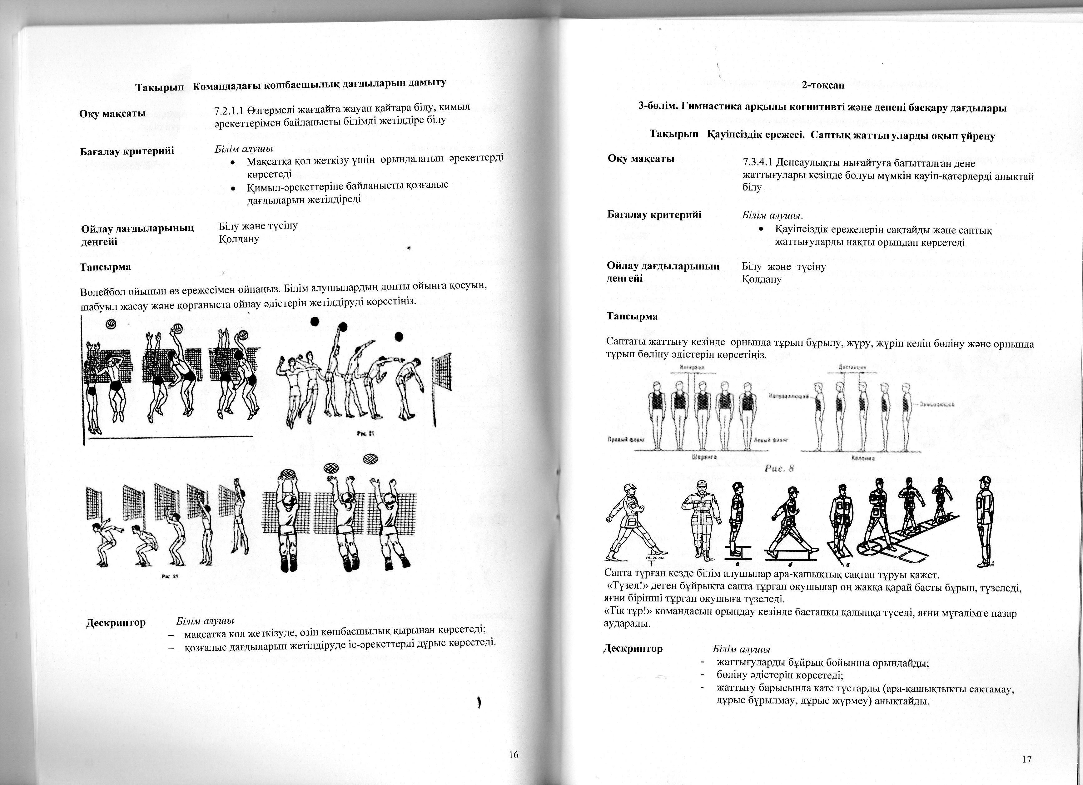 Тақырыптың маңыздылығымен танысады, денесін жаттықтырады,алған білімін өмірде қолдана алады. Барлық оқушылар техникалық тұрғыдағы спорттық жаттығуларды орындай алады және дағдыларды жетілдіре алады. Көптеген оқушылар спорттық арнайы қыймыл жаттығуларын орындау кезінде, қыймыл жүйелілігін сақтай отырып, дағдыларды шындайды. Кейбір оқушылар спорттық спецификалық жаттығуларды орындауда дағдыларды жалпылай отырып, қыймылдар жүйелілігін сақтайды. |