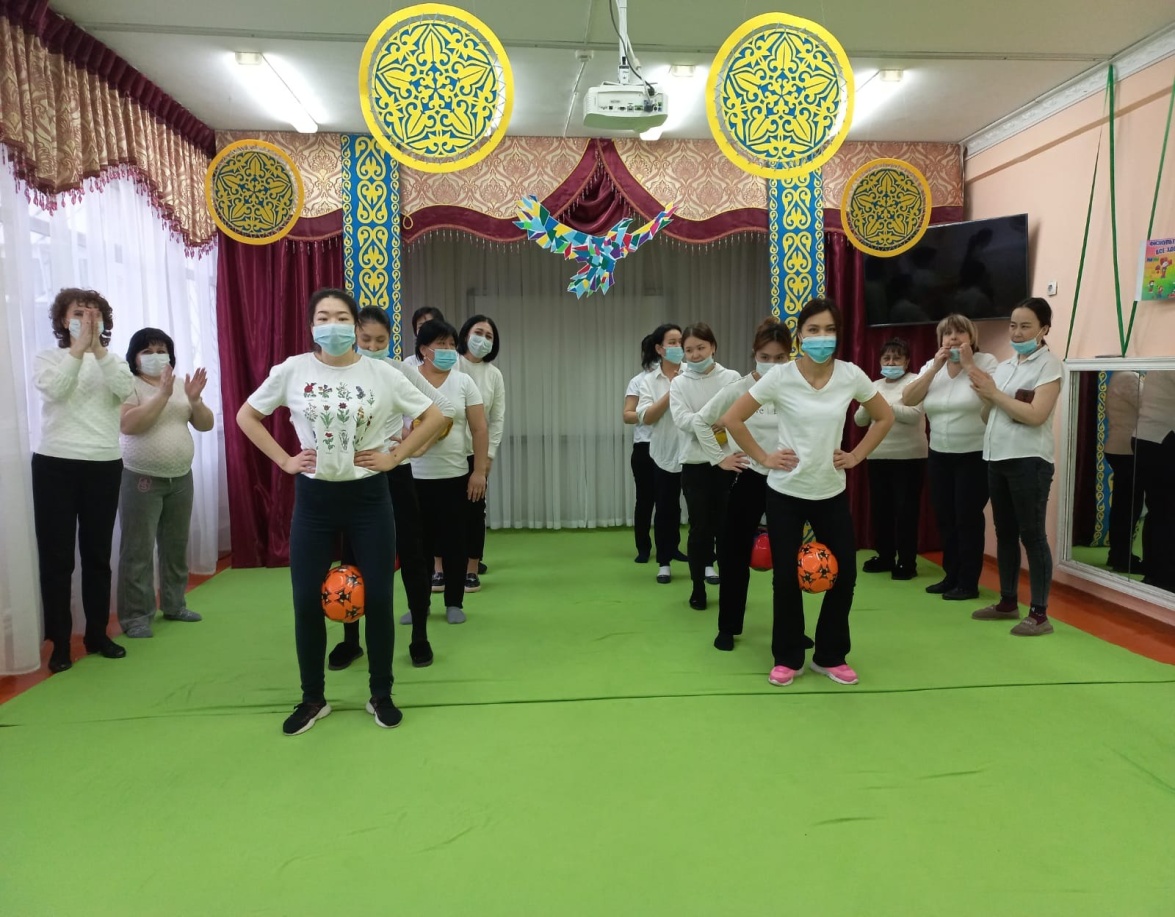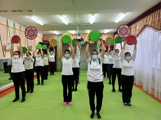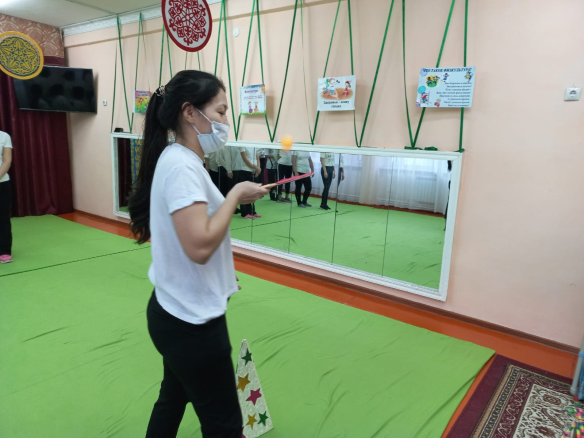 Дене шынықтыру нұсқаушысы Идрисова Салтанат Зиядуллоевна дене қыздыру жаттығуын жасатады