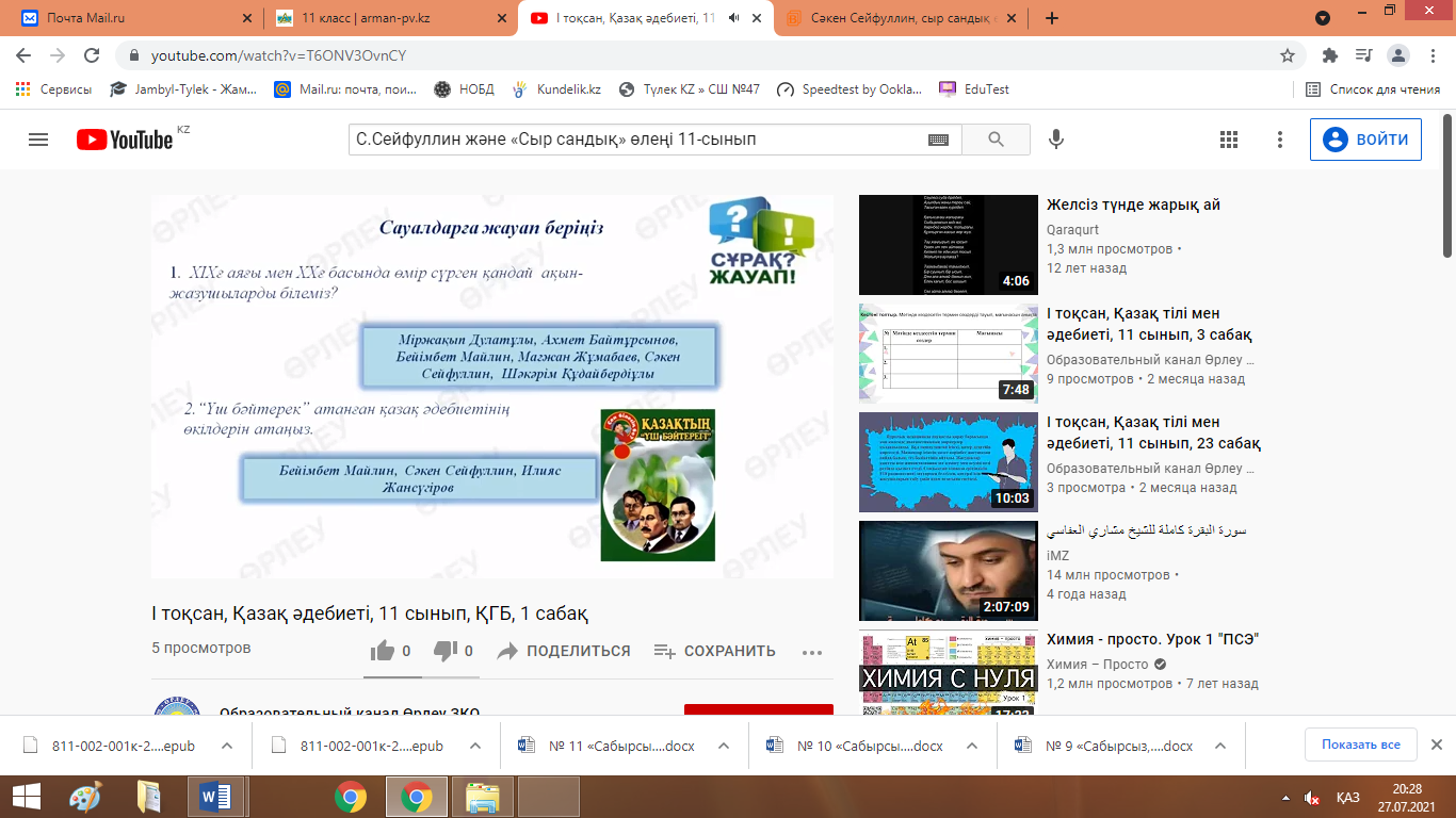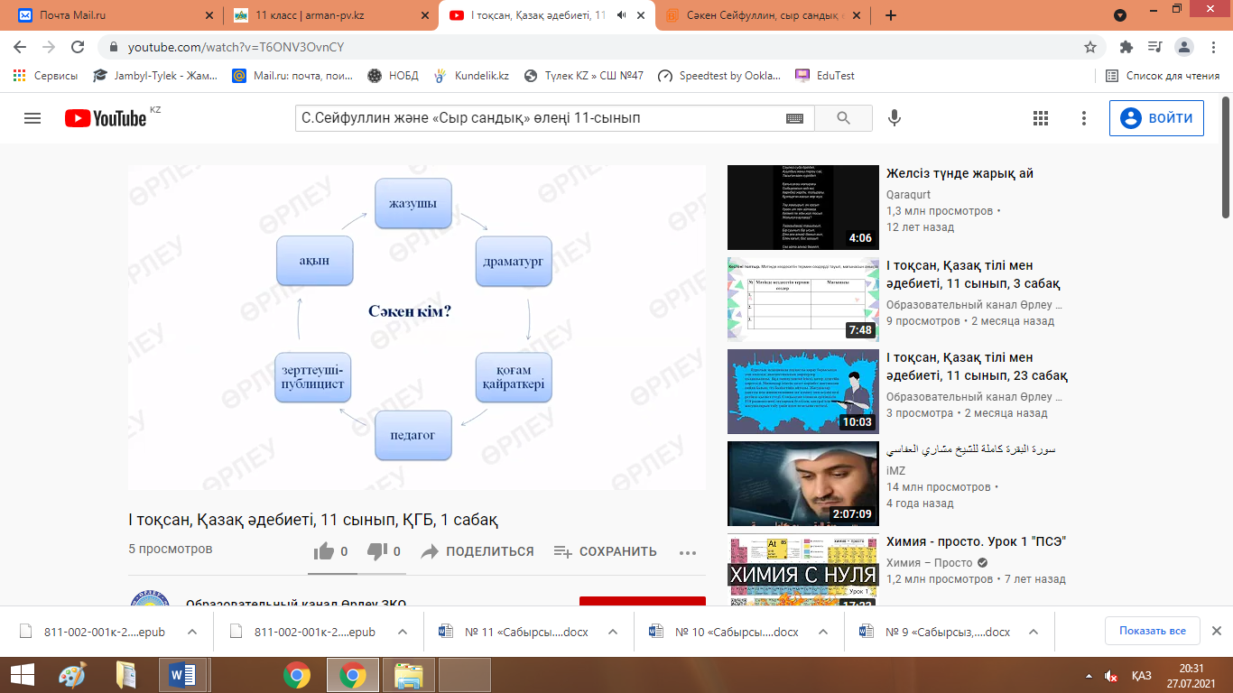 ҚБ Бекіту. «Сыр сандық» өлеңін интернеттен тыңдап, «Төрт сөйлем» тәсілі бойынша негізгі идеясын түйіндеп жаз. https://www.youtube.com/watch?v=Uzk7_CtSIL8 1. Пікір. Нақыл сөздер бойынша туындаған өзіндік пікіріңді бір сөйлеммен келтір. 2. Дәлел. Келтірілген өзіндік пікірді тағы бір сөйлеммен дәлелде. 3. Мысал. Енді өзіндік пікірді тағы да бір негіздеп кетуің үшін бір сөйлеммен мысал келтір. Мысалды өмірден алуың қажет. 4. Қорытынды. Өзіндік пікірді тағы да бір рет пысықтап, қорытынды шешімді бір сөйлеммен келтір. |
