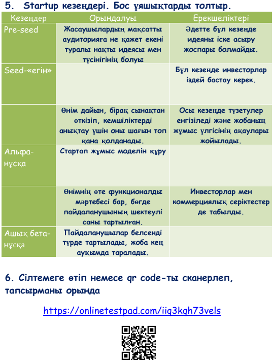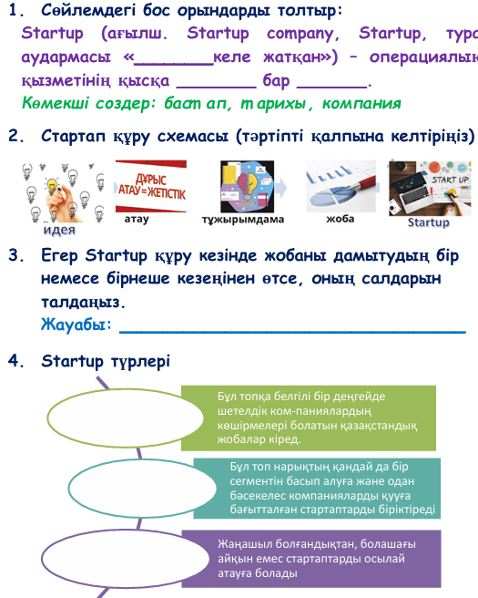 Оқушылар топтарға бөлінеді, тапсырманы топпен орындайды Дескрипторлар: - тиісті сөздерді қойып жазады - стартап құру тіртібін анықтайды - дұрыс жауабын жазады - стартап түрлерін жазады - кестені толтырады - интерактивті тапсырмаларды орындайды |