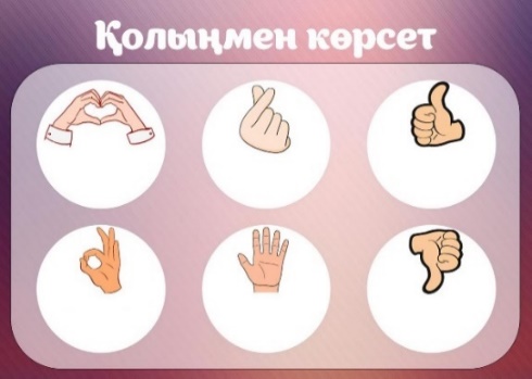Ұйымдастыру кезеңі Оқушылармен сәлемдесу, оқушыларды түгелдеу. Оқушылардың сабаққа дайындығын тексеру. Оқушылардың назарын сабаққа аудару. Сабақ мақсаттарымен таныстыру. Жағымды атмосфералық жағдай тудыру. (Қолыңмен көрсет)