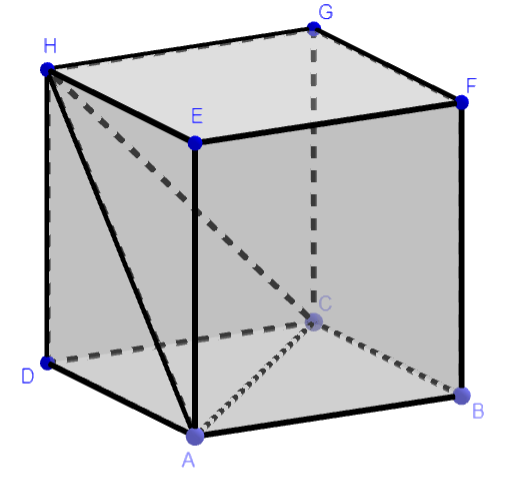 Суретте көрсетілгендей қыры 4-ке тең ABCDEFGH кубы берілген. F нүктесінен AHC жазықтығына дейінгі қашықтықты табыңыз.