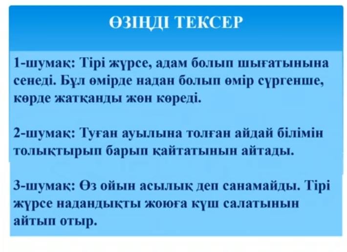 Дескриптор: Шығарманың идеясын түсіндіріреді; Автор бейнесін анықтайды; Өлең жолдарының мағынасын табады; Жұптық жұмыс Өлең бойынша 2 жауап 6-тапсырма. «Шығамын тірі болсам адам болып, Жүрмеймін бұл дүниеде жаман болып» өлең жолдары негізінде ойларыңды тұжырымдап, айтып беріңдер. Кері байланыс. "Ортадағы қаламсап" әдісі арқылы сұраймын. Тапсырмаға екі жауап беріп қаламды жүгірте отырып, сабақты қорытындылау. Жеке жұмыс Қызығушылық танытқан 1 нәрсе Стикерге оқушылар автор бізге не айтқысы келгендігін жазады. Рефлекция «ВЕЕР» әдісі Қағазды веер пішінінде бүктеп, бірінші оқушы бір бөлігіне және екінші бөлігіне өз ойларын, бүгінгі сабақтан түсінгендерін қысқаша жауап жазып тапсырады. Үйге тапсырма. 1.Өлеңді жаттау 2.5-тапсырма. «Сұлтанмахмұт шыңы» деген сөзжұмбақ құрастырыңдар.