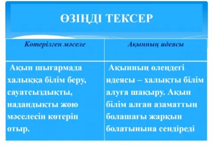 Өлеңге арқау болған ақын арманы, өмірлік мұратын оқушыларға жеткізу. Шығармадағы надандық пен қараңғылықты сынауын оқушыларға түсіндіру.Автор бейнесін анықтау. |