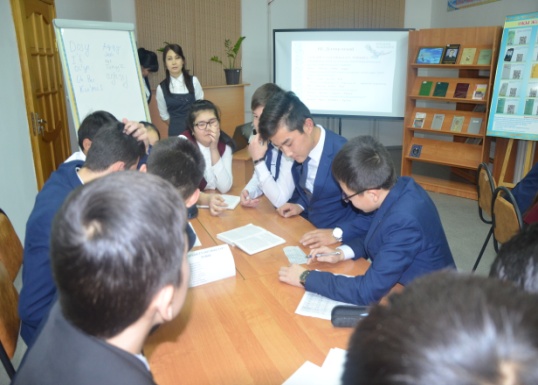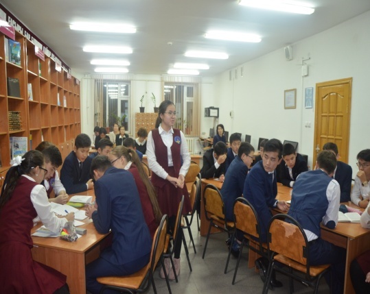 «Әдебиет әлемі»кезеңінің арнайы берілген тапсырма бойынша екі топтаөзіндік дайындықпен келгенін байқадық. Екі топтың тақырып аясында өзіндік зерттеу, зерделеу жұмыстарын жүргізіп, ойларын еркін, түсінікті тілмен жеткізе білді. Топтарға рахметімізді айта отырып, келесі кезең бойынша «Ділмар» кезеңіне кезек береміз. Бұл кезеңде оқушыларға роман аясында бірнеше сөйлемдер оқылады. Сол сөйлемдегі айтылмай тұрған сөзді тауып, орыс тілі, ағылшын тіліне аударып, латын тілі үлгісіндежазу тапсырылады. Олай болса, топтарға сәттілік тілейміз. Бірінші болып «Зерттеушілер» тобына кезек береміз. Жалпы бұл кезеңде екі топқа бес сұрақтан беріледі.