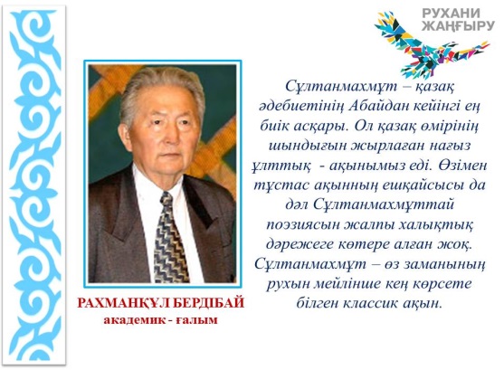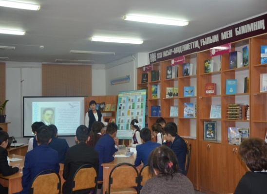 Кітапханашы: Елбасымыз айтып өткендей, «Өзінің биік, таза рухани қасиетімен Кітап мәдениет пен руханиятты қорғауда теңдесі жоқ қару болып табылады. Кітап адамзат баласына ағарту һәм білім сылайды» Сұлтанмахмұт Торайғыров – қазақ халқының сүйікті перзенті, асқан дарынды ақыны, ағартушы, педагогі.