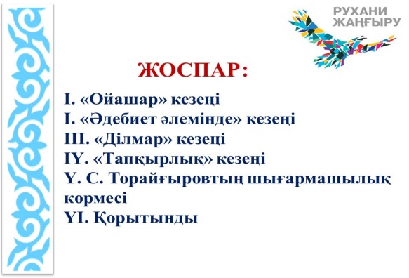 Тәрбиеші: Құрметті оқушылар және ұстаздар! Жалпы баршамызға белгілі биылғы оқу жылының тәрбие саласы бойынша басым бағыттардың бірі «Шаңырақ» оқушылар қауымдастығы аясындағы әлеуметтік жобалары аясында жұмыс жасау. Біз бүгінгі сабағымызды «100 кітап» жобасы аясында ХХ ғасырдың көрнекті тұлғаларының бірі С. Торайғыровтың «Қамар сұлу» романы бойынша өзіндік ой өрбітеміз. Абайдан кейінгі қазақтың жазба әдебиетінде әр түрлі жанрда өзіндік қолтаңбасын қалдырған тұлға С. Торайғыровтың шығармаларымен кеңінен танысып, шәкірттік ізденістерімізбен бөлісетін боламыз.