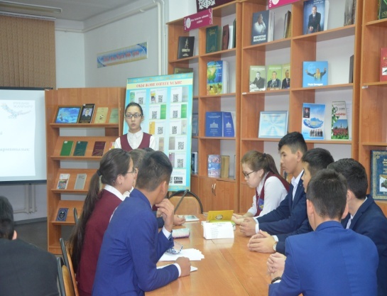 Тәрбиеші: Жарайсыңдар, балалар. Бүгінгі сабаққа үлкен дайындықпен келгенсіздер. Ендігі кезекте С. Торайғыровтың шығармашылық еңбектерінің көрмесі және қазіргі заманауи технологияда дамыған «QR Cade Reader» программасы ұялы телефон арқылы кітап оқуға қалай болады, сол жөнінде кітапханашы Бөгеналиева Айнұр апайларын тоқталып өтеді.