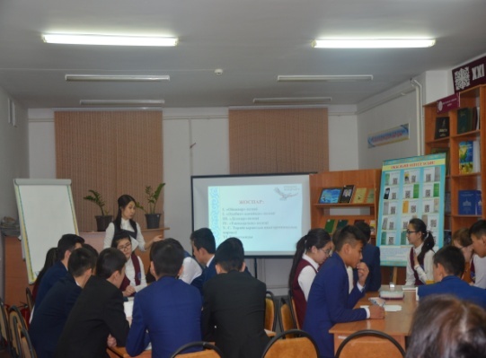 Тәрбиеші:Оқушылар «100 кітап» жобасы аясында негізінен әдебиет пән мұғалімі, кітапханашы және тәрбиешілер ұйымдастырып, жұмыстар жүргізіп, жүргенін білесіздер. Осы негізде сіздердің бүгінгі жұмыстарыңызды бақылау үшін әдебиет пәнінің мұғалімі Әубәкірова Ляззат апайларынды шақырып отырмыз. Ендеше сөз кезегін апайға берейік.