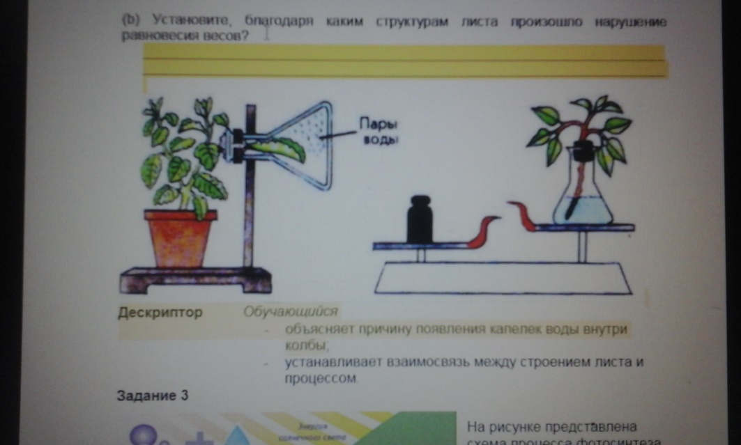 Дескриптор:Знают последовательность строения листа и понимают как взаимосвязаны строение и функции листа10 б Формативное оценивание:прием «Голосование точками»(самооценивание) Индивидуальная работа 3 задание: Дифференцированная работа «Кластер» на тему «Траспорт веществ» А «Кластер»:Типы пров тканей, значение, функции. Почему проводящая ткань не формируются у животных6 баллов В «Кластер»:типы проводящей тканей, значение и функции провод тканей 4 балла С «Кластер» типы проводящие ткани 2 баллов Формативное оценивание: самооценивание-по листу успешности Индивидуальная работа 4 задание: На рисунке показаны опыты, иллюстрирующие работу некоторых структур внутреннего строения листьев растения.