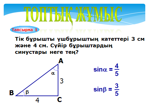 2-тапсырма Тік бұрышты үшбұрыштың катеттері 3 см және 4 см. Сүйір бұрыштардың синустары неге тең? 2.Есеп: Тік бұрышты үшбұрышы АВС-да А бұрышы 60 градус, ВС қабырғасы 4√3 см. ∆АВС ауданын тап.