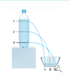 Суреттегі су құйылған ыдысқа назар аударыңдар. Неге ыдыстың тесіктерінен ағып жатқан су әртүрлі шашырап ағуда? Мұның себебі неде? Түсіндіріңдер. Егер ыдыстың түбіне қарай тағы бір тесік тессек, су І, ІІ және ІІІ нүктелердің қай жағына ағады? Осы бойынша өз тұжырымдарыңды ұсыныңдар.
