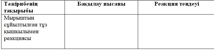 Дескриптор : мырыштың сұйылтылған тұз қышқылымен әрекеттесу үдерісін сипаттайды; бақылау нысанын жазады; реакция теңдеуін сөзбен жазады; реакцияның қорытындысын тұжырымдайды Жалпы балл-4 Дескриптор : бақылау нәтижелерін атайды; реакция теңдеуін жазады; реакция өнімдерін анықтап, қорытынды жасайды Жалпы балл-4 |