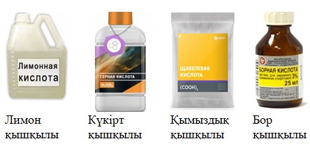 Сабақты бекіту тапсырмалары. 1-тапсырма (барлығы және ЕБК) Төменде суретте берілген қышқылдарды қолдану аясын атаңыз. Мысал келтіре отырып бос ұяшықтарды толтырыңыз
