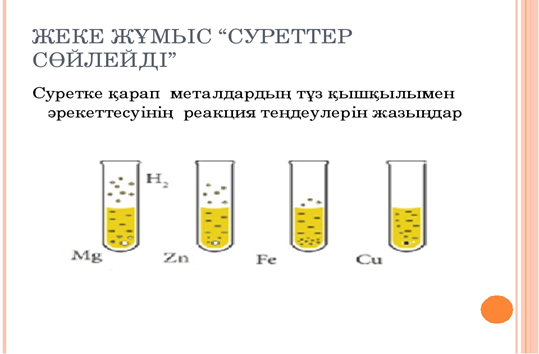 Қорытынды: электрохимиялық кернеу қатарында сутегіне дейін тұрған металдар ______________________________________________________________________ ____________________________________түзе әрекеттеседі.