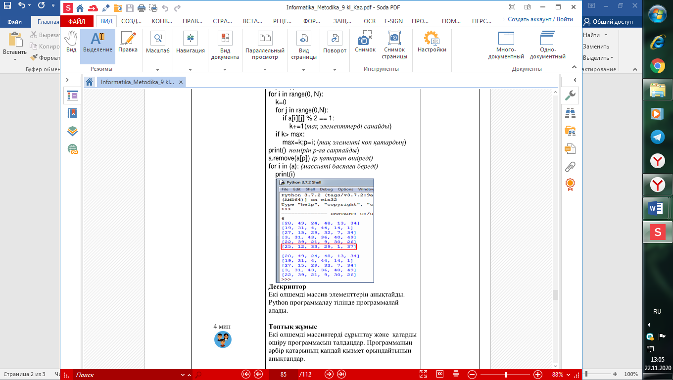 Python программалау тілінде екіөлшемді массив элементтеріне сілтеме жасау түрін анықтау; Екіөлшемді массив элементтерін қолданып есептерді программалау; Екіөлшемді массивті сұрыптау программасының кодын ұсыну. |