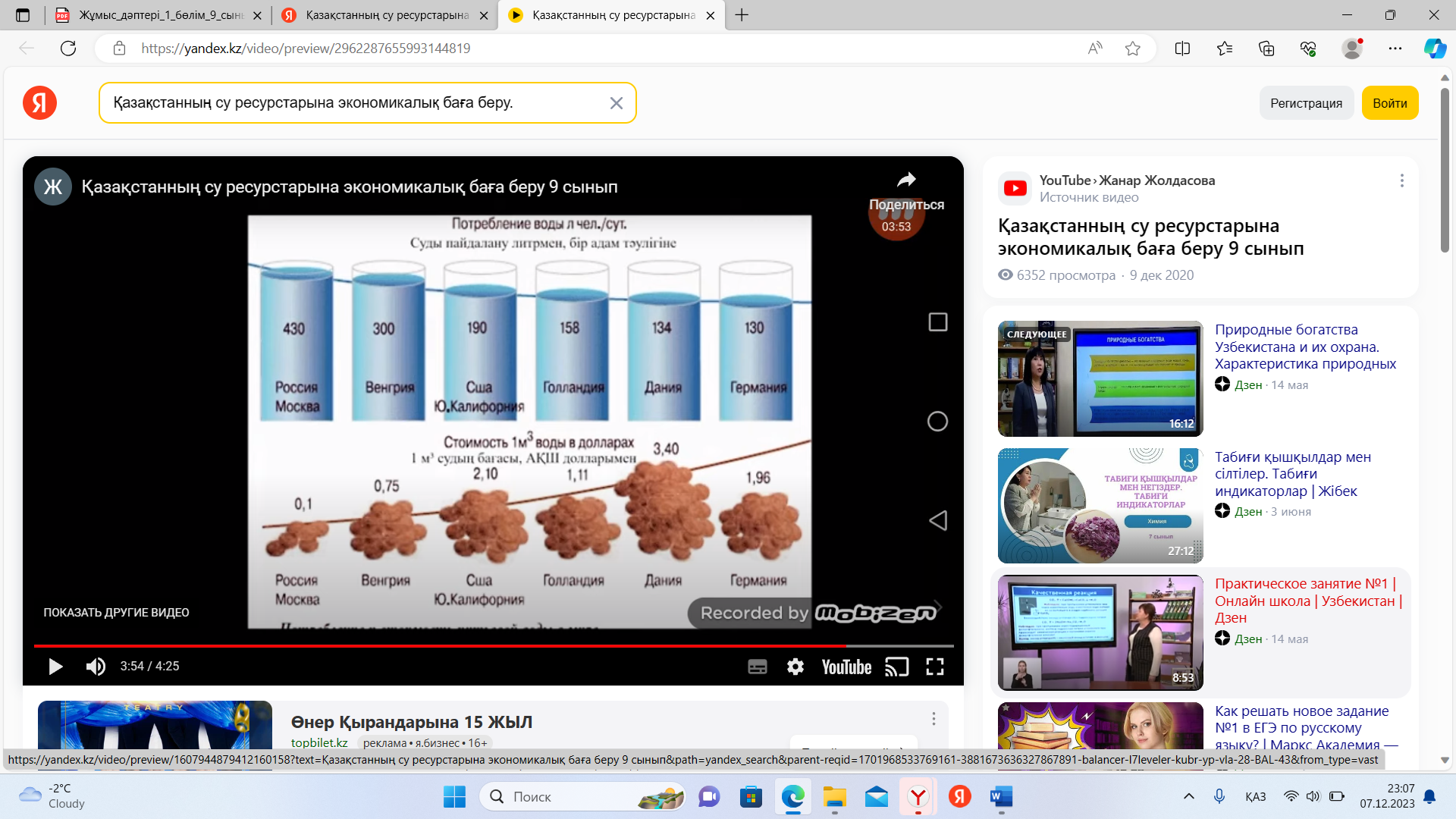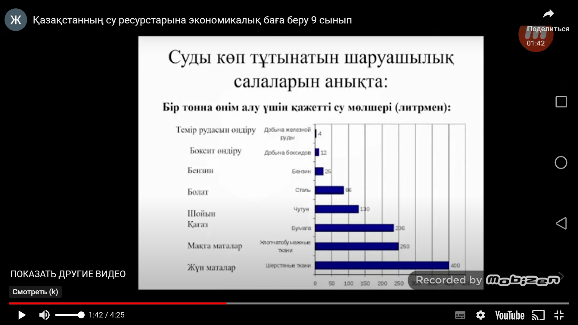 №3 тапсырма. Жеке жұмыс «Ойыңды жинақта» әдісі Тест тапсырмасы 1. Бір тонна шойынды қорытып оны болатқа және прокатқа айналдыру үшін қанша м³ су керек? А)200 Б)250 С) 270 2.Ең көп су шығыны қай қалады? А) Астан Б) Шымкент С)Алматы 3. Тұщы судың жетіспеу мәселесі қанша себепке байланысты А) 2 Б) 3 С) 4 4. Ең күшті сел 1921 ж Кіші Алматы өзенінде бір күнде қанша мм жауын-шашынның түскенінен пайда болған А)116мм Б)120мм С) 150мм 5. Тау беткейінен тау жыныстары массасының төмен қарай сырғуы не деп аталады А)сырғыма Б)көшкін С)су тасқыны 6. Қай жылдары Медеу шатқалында селден қорғайтын бөген тұрғызылды А)1967-1968 Б)1965-1967 С) 1966-1967 7. 1963 жылы 7 шілдеде Есік өзенінің жоғарғы ағысында қандай көлінің жарылуынан сел жүрді А)Жарсай Б) Үлкен Алматы С) Текелі 8. Сел тасқындары Қазақстанның барлық оңтүстік-шығысындағы қандай тауларда байқалады А) Сарыарқа Б)Іле, Жетісу, Талас Алатауы С) Мұғалжар 9. Таулы беткейден құлаған қар массасы А) Көшкін Б) Сырғыма С) Тасқын 10. Су ресурсын ластау көздерінің қанша түрі бар? А) Химиялық, биологиялық, физикалы Б) Химиялық, өсімдіктер С) Ауыл шаруашылығы Мақсатқа оралу жергілікті компонентті қосымша қамту негізінде су ресурстарының экологиялық проблемаларын анықтап , шешу жолдарын ұсынады |