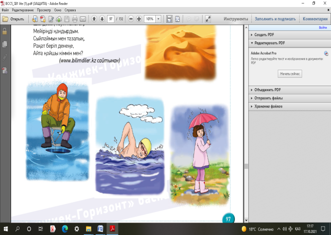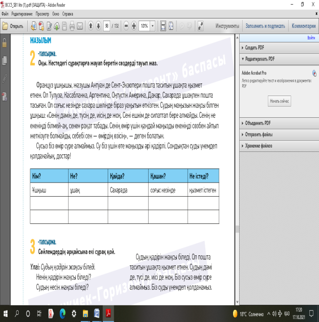 1.Сөздікпен жұмыс. Жаңа сөздермен таныстырады, оқушыларға қайталатады, жаңа тақырыпқа байланысты сөздіктермен жұмыс. 1-тапсырма.Айтылым. Жұмбақты шеш. Жұмбақтан суреттерде кездесетін сөздерді тауып, сөз тіркестерін құра. 2-тапсырма.Жазылым. Оқы. Кестедегі сұрақтарға жауап беретін сөздерді тауып жаз. 3-тапсырма Сөйлемдердің әрқайсысына 2 сұрақ қой. Үлгі:Судың қадірін жақсы біледі Ненің қадірін жақсы біледі? Ненің қадірін жақсы біледі? |