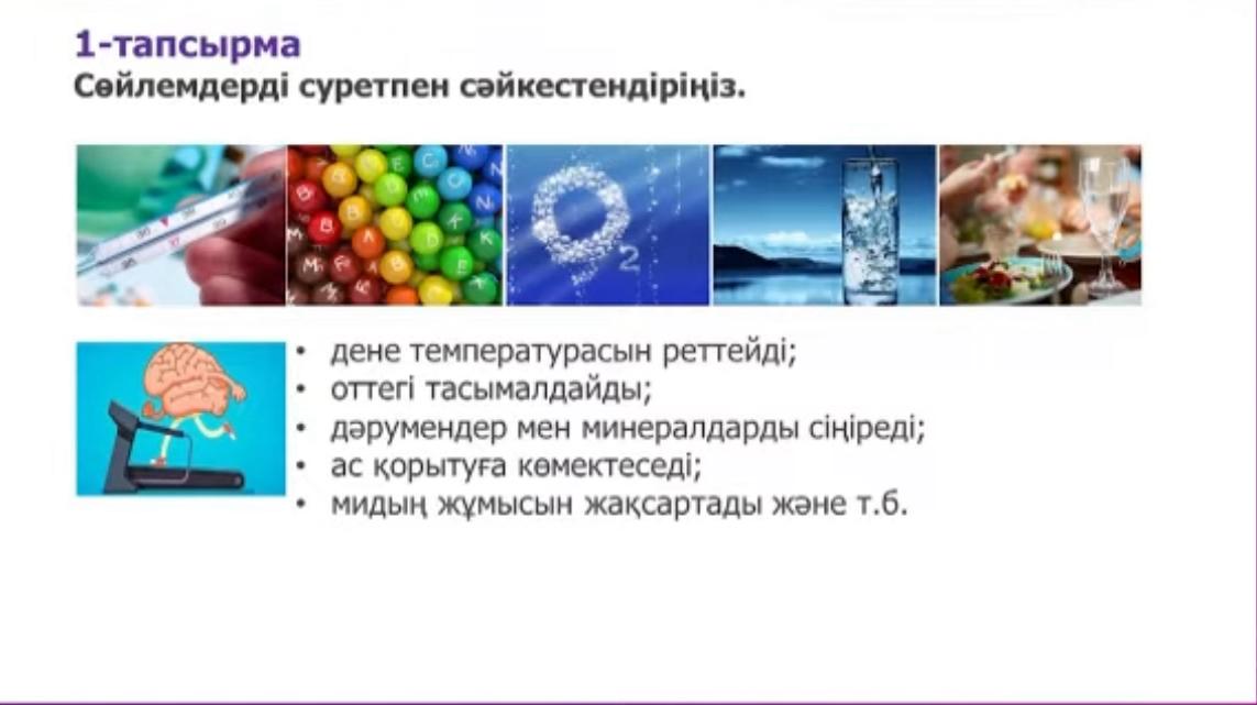 “Серпілген сұрақтар” әдісі арқылы су туралы өткен мәліметтерді бекітеміз. Не? (су) Су қандай болады? (мөлдір, түссіз, ащы, тұщы, иіссіз, дәмсіз) Су қайда кездеседі? (мұхит,өзен, көл, теңіз, бұлақ жауын-шашын, бұлт,) Судың неше күйі болады? Қандай? Судың қатты түріне нелер жатады? Жаңбыр судың қай түріне жатады? Сусыз адам, табиғат өмір сүре ала ма? Судың қайда қолданамыз? (өсімдік, жануарлар,көлік, тазалық, ауызсу, ауыл шаруашылығында) Су бойынша өткен сабақта өткен жаңа сөздерді еске алайық: Сараланған тапсырмалар; 1 төмен деңгейлі оқушылар жаңа сөздердің аудармасын сәйкестендіреді Сәйкестендір: Тамшы – капля Су қоры –запас воды Тіршілік көзі – источник жизни Маңызы – значимый, важный Қырау - иней Қалған оқушылар тақтадағы берілген сөздердің анықтамасын сәйкестендіреді Тамшы – табиғаттағы барлық судың мөлшері Су қоры – жаңбыр жауғандағы судың кішкентай бөлігі Тіршілік көзі – судың пайдасы Маңызы – судың қатты күйі Қырау - су Жаңа сөздер: Пайда – польза Ас қорыту – пищеварение Тасымалдау – доставлять Сауықтыру - оздоровление Шипалы – лечебное свойство Ағза - организм Синонимі - пайдалы, Емдік қасиеті бар. Мысалы: Судың шипалық қасиеті бар. Ағза – адамның дене мүшелері Мысалы: Адам ағзасына су өте пайдалы |