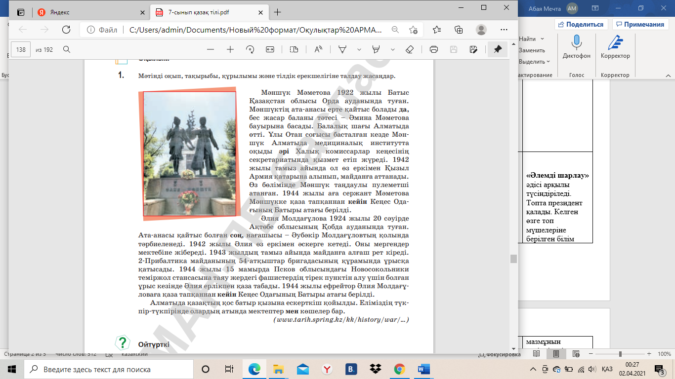 Грамматикалық тақырыпты меңгереді. Грамматикалық деңгейлік тапсырманы орындайды. Тыңдалым мәтініндегі бейнелеуіш сөздер мен тіркестерді теріп жазады; Екі мәтіннің ортақ белгілері мен айырмашылығын Венн диаграммасымен салыстырады; Қыстырма сөздерді қатыстырып, ой тұжырымын жазады. |