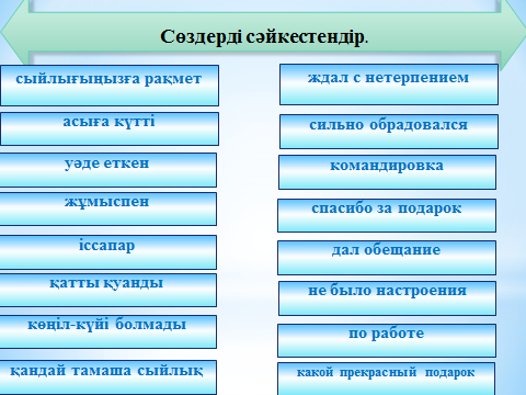 -Ендеше біздің бүгінгі сабағымыздың тақырыбы: «Сыйлығыңызға рақмет!»- деп аталады.(Тақырыпты орысша аударып беру).