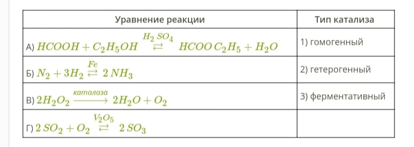 Установи соответствие между уравнением реакции и типом катализа в этой реакции. К каждой позиции, обозначенной буквой, подбери подходящую позицию, обозначенную цифрой. Внеси цифры в таблицу. (Цифры могут повторяться.)