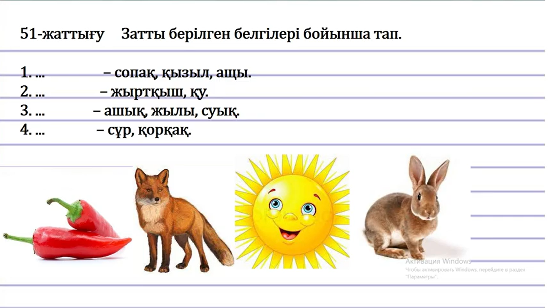 3.2.3.1 мәтін мазмұны бойынша пікір білдіруге бағытталған сұрақтар құрастыру және жауап беру; 3.4.2.3 сөйлемнен сөз таптарын (зат есім, сын есім, сан есім, етістік) табу |