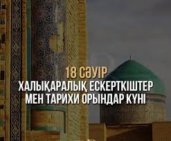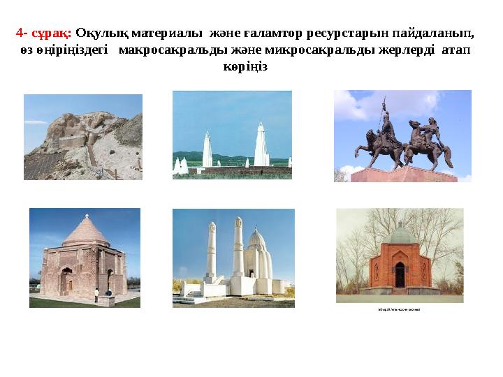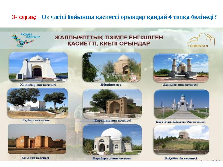 - Суреттер – адамның рухани мәдениеті мен дүниетанымынан ақпарат беретін қайнар көз. Қазақстанда 25 мыңға жуық тарихи ескерткіштер бар. Олардың бәрі мемлекеттің қорғауына алынған. Ал Қожа Ахмет Яссауи кесенесі 2003 ж. 5 шілдесінде ЮНЕСКО-нің Бүкіләлемдік мұра тізіміне тіркелді. Қожа Ахмет Ясауи – шамамен 1040 жылы (кей деректе 1103 немесе 1093, 1095) Сайрам (кейбір деректер бойынша Ясы) қаласында дүниеге келіп, 125 жыл жасаған Түркі әлеміндегі мұсылмандық дәстүрді орнықтырған ғұлама ұстаз. Әкесі – Ибраһим, анасы – Қарашаш ана. Йасауидің ата-анасының зияраттары Сайрамда. Деректерде Қ. А.Йасауидің Ибраһим атты ұлы мен Гаухар атты қызы болғаны айтылады.