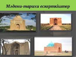 Сәлеметсіңдер ме, балалар, бүгінгі біздің өтетін тәрбие сағатымыздың тақырыбы «Тарихи мұраны сақтау біздің борышымыз» деп аталады. Яғни бүгін сендермен біз тарихи ескерткіштердің түр-түрлерімен таныса отырып, толық мағлұмат аламыз. - Балалар сендер қандай ескерткіщтерді білесіңдер? - Ескеркіш дегеніміз не? (Ескерткіш–кең мағынасында — елдің, халықтың мәдени мұрасының жалпылама атауы. Тарих және мәдениет ескерткіштерінің жиынтығы мұражайлық, көрмелік маңызы бар заттар мен жылжымайтын ескерткіштерді (құрылыстарды, ғимараттарды, т.б.) қамтиды). - Егер білмесек қазір мен сендерді ескерткіштердің түр-түрлерімен таныстырып өтемін.