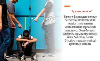 Мұғалім: -Балалар, жаңа ғана өздерің айтқандай айналамыздағы адамдардың дұрыс емес іс-әрекеті біздің көңіл- күйімізді түсіріп, ренішті жағдайға әкеледі екен. Ендеше бүгінгі сабақта буллинг туралы білетін боламыз және буллингті болдырмау жолдарын қарастырамыз. Буллинг - бұл жаман әрекеттер, олар басқа адамдардың эмоциялық және физикалық жағдайына зиян тигізеді. Өзіңді қорғау үшін буллинг туралы біліп, оны тоқтатуға тырыс. Буллинг дегеніміз не? Зорлық-зомбылық көрсету Физикалық немесе сөзбен қорлау, қауіп төндіру. Қысым көрсету Басқа адамдардың пікірлерін, әрекеттерін бақылауға тырысу. Қорқыту Қорқу сезімін тудыру, қауіп төндіру арқылы бағындыру.