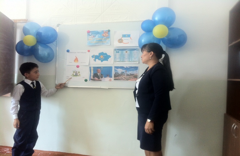 Елбасы суреті, Қазақстан Республикасының картасы, рәміздер, авторларының суреттері, қанатты сөздер, гүлдер, слайд, Астана қаласына байланысты суреттер.