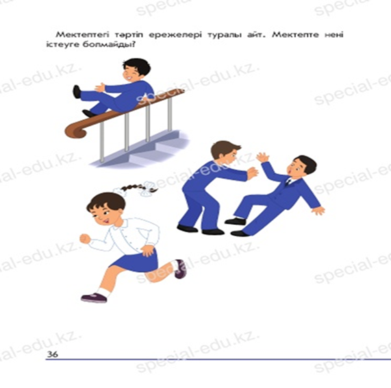 Мұғалім: - Қоғам әрқашан тәртіпке негізделіп, арқа сүйеп қалыптасып, тіршілік етеді. Қоғамда тәртіп болмаса, ол құлдырайды, яғни, келешегі болмайды. Мұны адамдар ежелден-ақ жақсы түсінген. Сондықтан да қоғамда тәртіп орнатудың жолдарын қарастырған. Сұрақ-жауап: -Тәртіп сақтау деген не? -Тәртіп сақтау не үшін қажет? -Тәртіп сақтауға жататын іс-әрекеттерді ата. -Сендерге тәртіп сақтауды кімдер үйретеді? -Тәртіп сақталмаған жерде қандай жағдайлар болады?