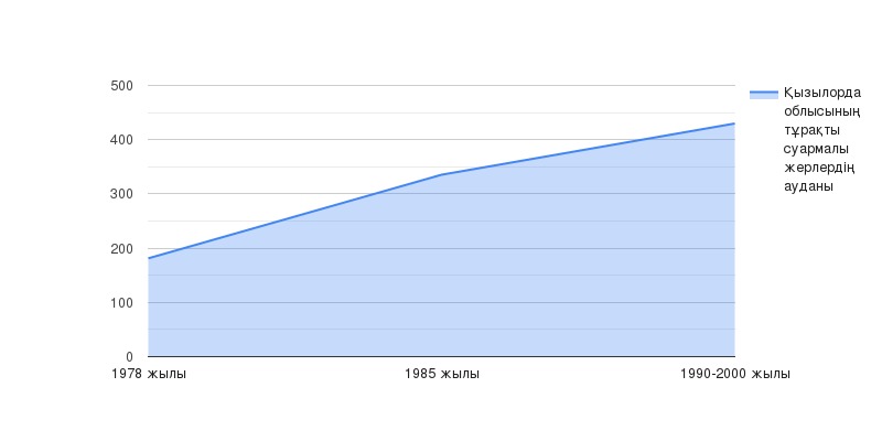 Антропогендік процестердің негізгі себебі аумақтың шөлейттенуі Арал теңізі мен жер асты сулары деңгейінің тұрақты төмендеуіне әкеп соққан Сырдария гидрорежимін реттеу болып саналады. Осылайша, Қазақстан мен Орта Азияда суармалы егіншіліктің күшеюі бұрын Арал теңізіне келіп түскен өзен ағынын қайтарымсыз алып қоюға әкеп соқтырды. Тек 1961 жылдан 1975 жылға дейін шаруашылық қызмет есебінен Арал 215 км3 су алмады, оның көп жылдық қоректенуімен 56,4 км3, судың табиғи шығындары өзгерді, жылдық ағын көлемі қысқарды. Кейбір жылдары, 1970 жылдан бастап, Сырдария өзені Арал теңізіне суды сирек жеткізді, су тасқыны іс жүзінде тоқтады, бұл аумақтың қатты құрғауына, жер асты суларының деңгейінің төмендеуіне, галогеохимиялық жағдайды өзгертті, ал 1990 жылға қарай Амудария бойынша ағын тоқтады. Егер 1978 жылы Қызылорда облысының аумағы бойынша тұрақты суармалы жерлердің ауданы 181,3 т. га құраса, 1985 жылға қарай бұл көрсеткіш 335,4 т. га дейін өсті және тиісінше 1990-2000 жылдарға қарай 429,9 мыңды құрауы тиіс. га, оның ішінде үлкен көлемдегі суды қажет ететін күріш астындағы алаң, тиісінше 72,9 мың га, 102,0 және 145,0 мың га (1-сурет)