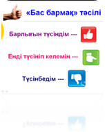 Әр тапсырма соңында топтар бір- бірін «Рахмет айту», «Бағдаршам», «Бас бармақ», «Шапалақтау» әдістерімен бағалайды |