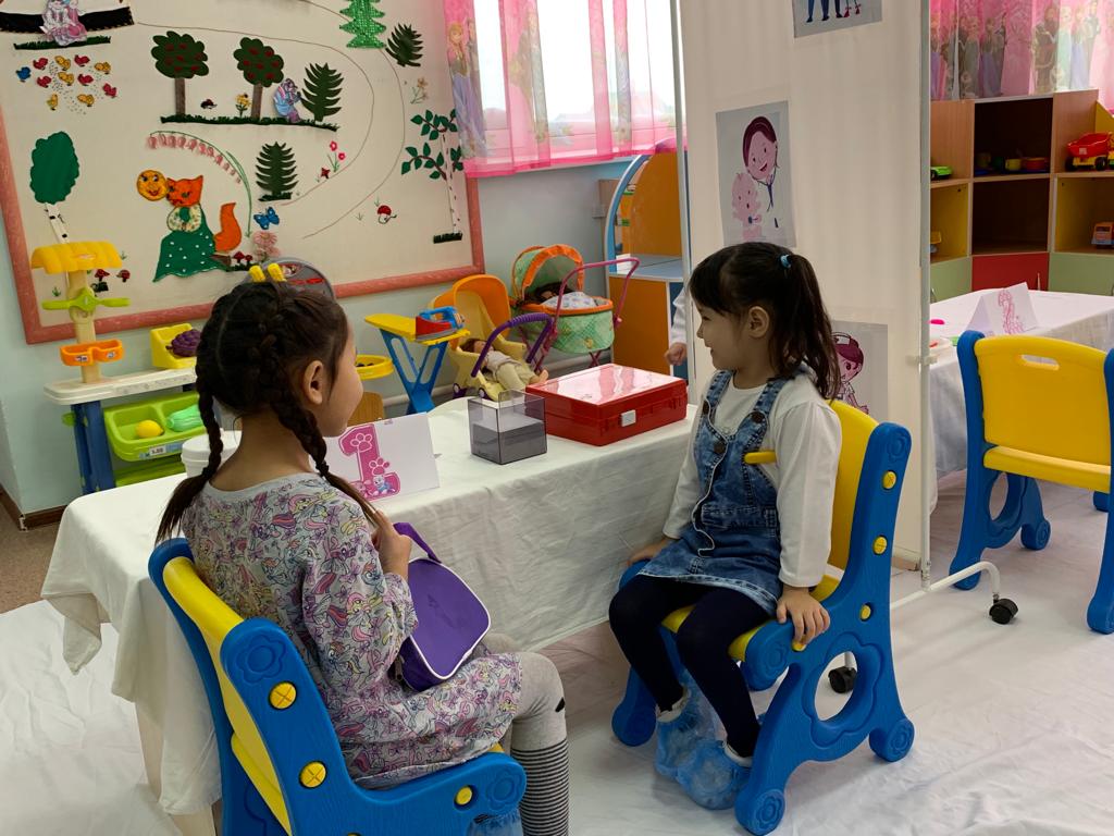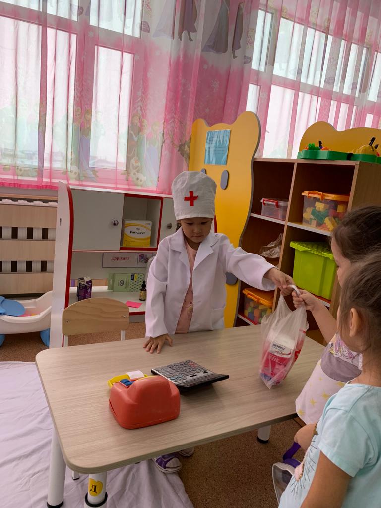 - Қазақ тілі педагогы: Олай болса, бүгін біз сендермен бірге «Емханадағы» «Дәрігер» ойынын ойнаймыз. Қане, балалар өздерің орындарыңа барып жайғаса қойыңдар. Балалар өздерінің орындарына барып жайғасады.(Алдын ала рөлдерге бөлінген балалар дәрігерлік сала бойынша «Емхана кабинеттерінде» отырады). Алғаш болып, балалар дәрігеріне бір ана қызымен келеді.
