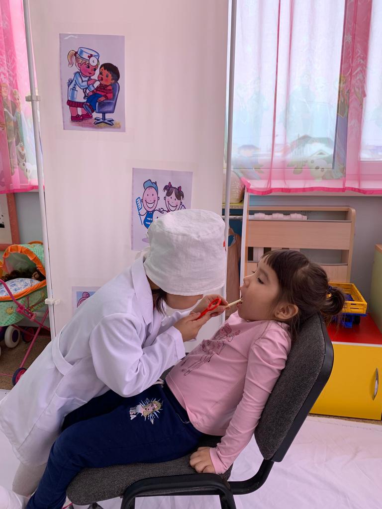 - Дәрігер: Қане, аузыңды аша ғой. (Тексеріп көреді). Тісіңді құрт жеп қойыпты. Тәтті нәрсені көп жеме. Күніне 2 мезгіл тісін тазалау керек. (Баланың тісін емдейді.)