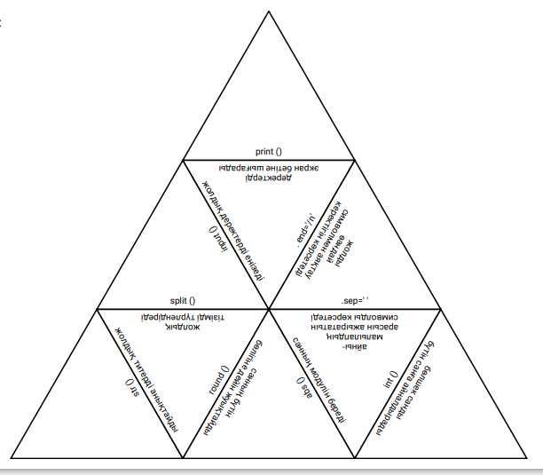 Қиынды сөздерден Python тілінде қолданылатын функиялардың қызметін жауабымен дұрыс сәйкетендіріп,Үшбұрышты дұрыс құрастыру керек. |