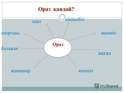 Тыңдалым,айтылым. Құсбегілік-птицеводство Қоржын-корзина Үлестіріп-раздавать Азық-питания, корм Сауға-дар, подарок из охотничьей добычи Олжа-добыча риза қылу-быть благодарным маңайы-окрестности шапшаң-быстро Айтылым *Құсбегілік жөнінде не білесіңдер? *Қалай ойлайсыңдар, аңшылық пен құсбегілік бірдей кәсіп пе? Айтылым Көп нүктеге назар аударып, әңгімені әрі қарай жалғастырыңдар.Ораз қандай адам екен?Кластер түзіп, мінездеме беріңдер.