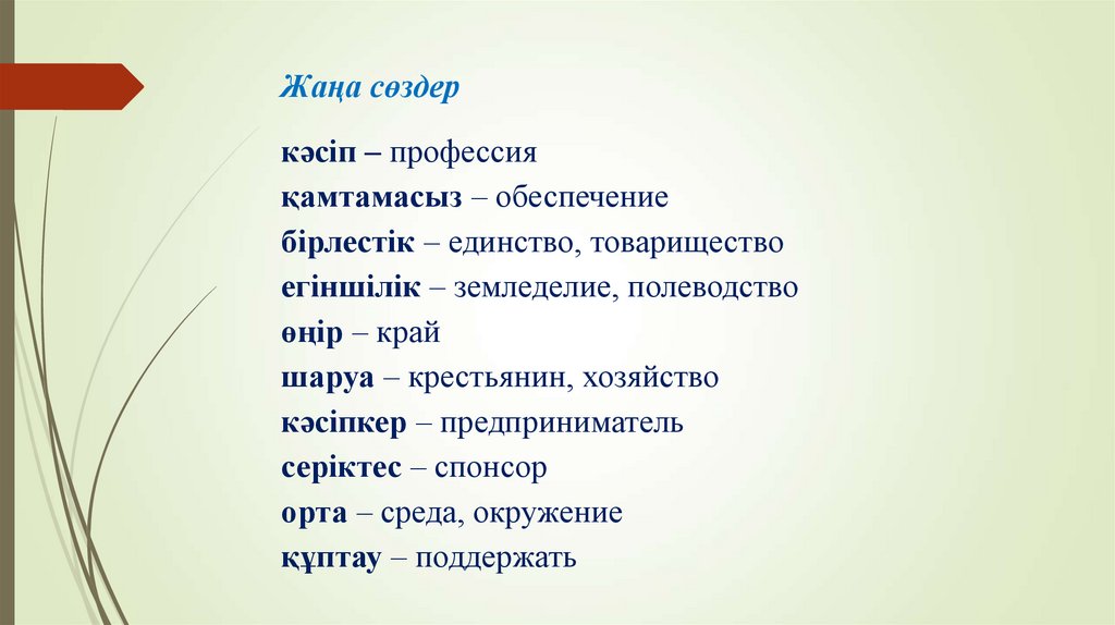 Алақан, құрық, жауапкершілік, молшылық, ұнжырға Пәндік лексика терминдер жоспар — план — plan несие — кредит — credit бизнес — бизнес — business |