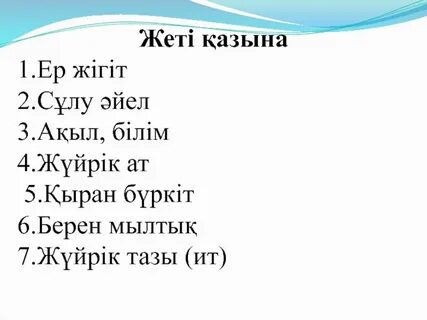 Жазылым Көп нүктенің орнына тиісті сөздерді жазып, жеті қазынаны толықтырыңдар.