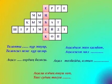 кетеді, (болса) 2.Ел болам.. бесігіңді түзе. (десең) 3.Ойнап... де, ойлап сөйле (сөйлесең) 4.Әзіл.. әділ айт. (айтсаң да,) 5.Ұлық... кішік бол. (болсаң) Жазылым Қосымша тапсырма Жеке жұмыс Айтылым тапсырма Жұптық жұмыс тапсырма Айтылым Жеке жұмыс |