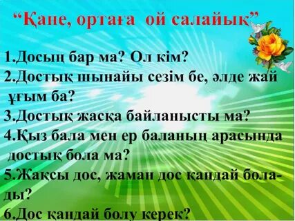 Тыңдалым,айтылым. Татулық-мир Берік-крепкий Адалдық-честность Жалғын-ложный Жақындық-близрсть Ықылас-желание Айтылым *Достық ұғымын қалай түсінесіңдер? *Достық пен татулыққа қатысты қандай мақал- мәтелдер білесіңдер? 1. Дос деп қандай адамды айтамыз ? 2. Қандай адамның досы көп болады? 3. Сенің досың бар ма? 4.Ол қандай адам? Айтылым Суреттер бойынша әңгімеле. Суреттерден не көріп тұрсың? Өз жұбыңа сұрақтар қой.Сұрағыңда Сыйластық, ықылас, қымбат, татулық, шынайы, ықылас тіркестері болсын. Жазылым Көп нүктенің орнына тиісті сөздерді жазып, мақал- мәтелдерді толықтырыңдар. 1.Дос жылатып айтады, .... күлдіріп айтады 2.Кекшіл ..., көпшіл бол 3.Жалған сөз жанға ... 4. ... ... берік бол, Досыңа серік бол Тиісті сөздер: дос, болсаң, қас, дұшпан, болма Айтылым Етістіктің шартты райында тұрған сөздерді тауып астын сызыңдар 1.Асан бүгін кітабын оқыса, ертең кітапханаға тапсырады. 2.Ертерек айтсамшы, бұлай болмас еді. 3.Білгеніңді айтсаңшы, бәрін қазбалап қайтеді. 4.Қазақ осы ашық жарқын қабағы , Қонақ келсе ,шабылып бір қалады. |