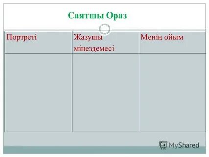 Тыңдалым,айтылым. Саятшы-охотник с ловчими птицами Аңшы-зверолов, охотник Сақталмаған-не сохранилось Қойнауында-ложбина,лощина Мылтық-винтовка Оқ-пуля Мерген-стрелок Айтылым *Суретте кім бейнеленген? *Қалай ойлайсыңдар, саятшы және аңшы сөздерінің айырмашылығы бар ма? Айтылым Суреттер бойынша әңгімеле. Суреттерден не көріп тұрсың? Өз жұбыңа сұрақтар қой.Сұрағыңда Саятшы, аңшы, сақталмаған, қойнауында, мылтық, шиті, жалғыз, оқ, мерген тіркестері болсын. Айтылым Әңгіме үзіндісін тыңдаңдар. Естеріңде қалған ақпараттарды дәптерлеріңе жазыңдар. Жағдаятқа құрылған рөлдік ойын ойнаңдар. Ойын шартын сақтаңдар. «Дөңгелек устел» ойыны. Топқа бөлініңдер. Топтағы бірінші оқушы қағаздың шетіне мұғалімнің «Не?» деген сұрағына басқаларға көрсетпей жауап жазады. Екінші оқушы да «Қандай?» деген сұраққа жауап жазып, келесі оқушыға береді. Айтылым Мәтін бойынша Ораздың портретін сипаттаңдар.