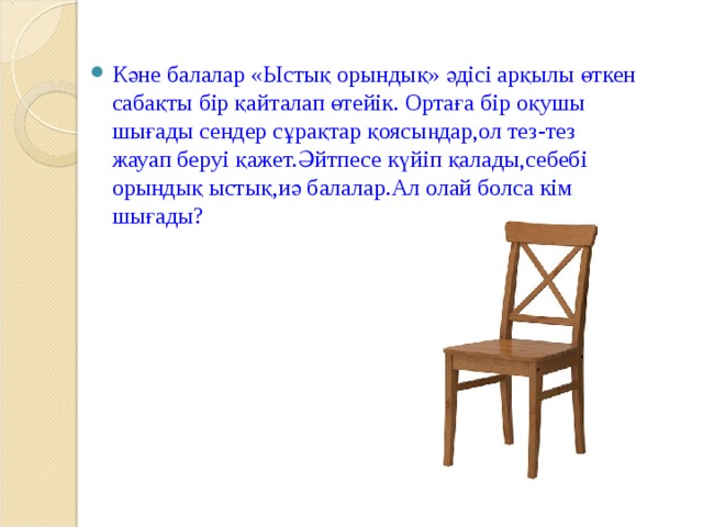 «Психологиялық жағымды ахуал қалыптастыру: - Көңіл күйлеріңіз қалай? - Керемет( қолдарын жоғары көтереді) Сабаққа дайындықтарың қалай: - Тамаша (алақандарын шапалақтайды) Үй жұмысын тексеру Тізбекті сұрау Бұл тәсіл логикалық тапсырмалар орындағанда қолайлы. Бір оқушы сөйлем бастайды. Мұғалім иегімен нұсқаған оқушы сөйлемді іліп әкетіп, ойды жалғастыруы керек. |