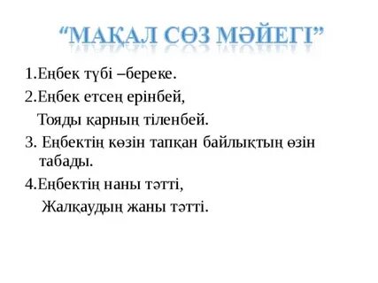 Айтылым Төменде берілген сөздерді мұғалімнің оқуында екі-үш рет тыңдау. /аудио түрінді тыңдатуға болады./ 1. Еңбегін сауды – адал күн кешті. 2. Ешкімнің ала жібін аттамау – қиянат жасамау 3. Айды аспанға шығарды – аты шықты, таң қалдырды. 4. Айыоңынантуды – жолыболды. 5. Алақанына түкірді – іске дайын тұрды. 6. Ат-тонын ала қашу – басын алып қашу, жауапкершіліктен бас тарту. 7. Құрығы ұзын – билігі күшті. 8. Діңкесі қату – шаршау. 9. Жалғанды жалпағынан басу – молшылықта өмір сүру. 10. Иығына су кету (иығы салбырау, ұнжырғасы түсу, салысуға кету) – қажу, шаршау. — Жоғарыдағы тұрақты тіркестердің мағыналарын топта талқылау. — Аталған тұрақты тіркестерді пайдалана отырып, сөйлемдер құрастыру. Оқылым Мәтінді оқып, тақырыбын қойыңдар. Тілдік ерекшеліктері арқылы мәтіннің қандай жанрда жазылғанын (мақала, сұхбат, жолдау, очерк) анықтаңдар. Жазылым Айтылым Мұғалім мақал- мәтелдердің басын оқиды , жалғасын табулары керек. Кәсіп болмай
