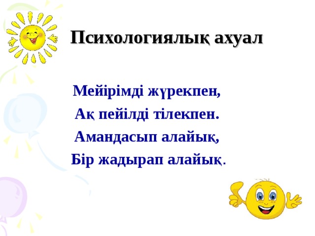 «Психологиялық жағымды ахуал қалыптастыру: “Мен –ғажаппын!” Әр адам өзіне қаншалықты баға берсе, соған соншалықты лайықты болады. Тұлға ретінде қалыптасуың үшін өзіңді, өмірлік іс-әрекетіңді лайықты бағалай білуің керек. Өзіңе арнап неғұрлым жақсы, жағымды, жылы сөздерді көбірек айту керек. Өзіңді-өзің дұрыс бағалағаның жөн. Әр адамның өзіне арнаған жақсы, жағымды қолдау, мадақтау, мақтау сөздері болуы тиіс. Мысалы: - Мен осы өмірге келуіммен кереметпін. - Мен сияқты бұл өмірде ешкім де болған емес, болмайды да. - Мен ғажаппын, мен кереметпін. - Менің күш-жігерім көп, денсаулығым мықты. - Мен өмірді сүйемін, өмір мені аялайды. Үй жұмысын тексеру « Қарлы кесек» әдісі арқылы алдыңғы оқуды еске түсіру. |