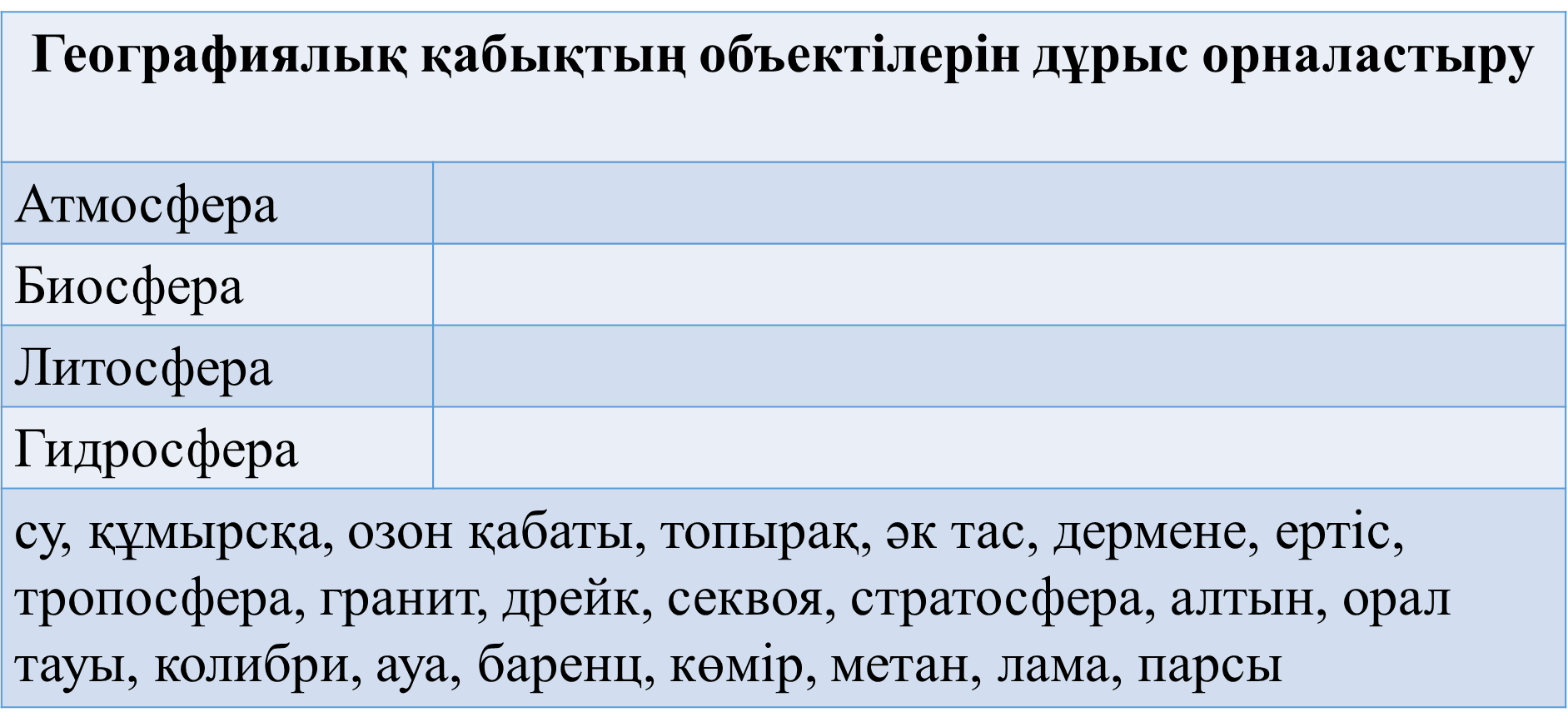 Мәтінмен жұмыс Тапсырма 1. (жеке жұмыс) Оқулықты пайдаланып таблицаны толтырыңыз: -Мәтін негізінде кестені толтырыңдар.Кестенің бірінші жолында толтыру үлгісі берілген.